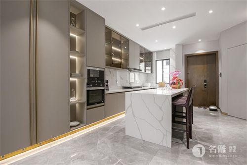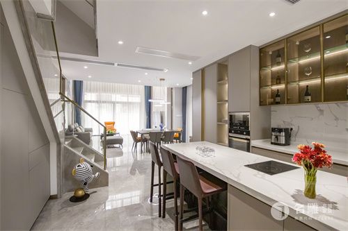 ??利用淺色系櫥柜過渡,入門是全開放廚房,烹煮、休閑、收納一體,L型柜臺讓操作更流暢,島臺滿足廚藝交流,打破交互局限,營造不一樣的生活場景。
