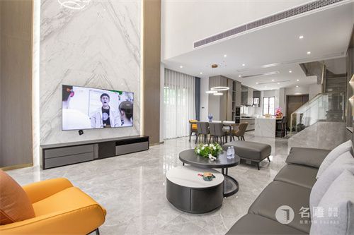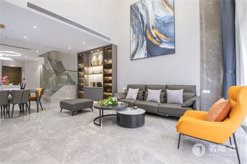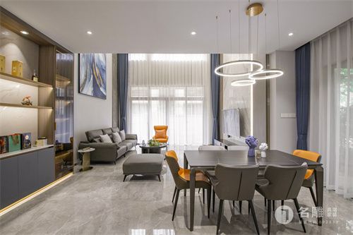 ??從入戶延伸,摒除區(qū)間邊界,以開放式姿態(tài)糅合重塑,擴大視野尺度,光透過紗簾傾瀉而下,建筑內(nèi)暖度升溫。 ??大面積留白瓷磚,灰白主調(diào)搭配同色系家具,藍(lán)色水墨背景畫和橙黃點綴其中,沉穩(wěn)不失活躍。茶幾的圓弧處理,木飾面和隱藏?zé)魩У?,都是精心?xì)節(jié)。 □ □ □ “ 自由、開放、愛與食光 ”