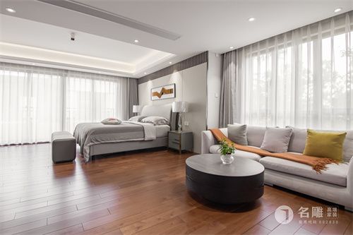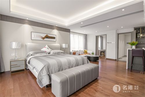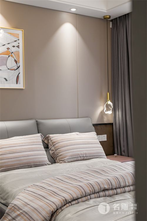 ??保持與客廳調(diào)性,主臥打造成多功能生活區(qū),集合酒水吧臺、休閑區(qū)、衣帽間,布局有序,自成天地。 ??主臥位置優(yōu)秀,陽光飽和,無主燈增添光度,床品沙發(fā)皮質(zhì)棉麻材質(zhì)作用,墻面藝術(shù)涂料印透的自然質(zhì)感,將其簡雅屬性拉至滿分,彰顯主人不俗品位。