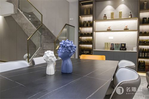 ??客廳和餐廳無縫連接,空間對話自由,巖板餐桌和桌角支撐弧形設(shè)計,耐磨易清潔特點,適用孩子家庭,配上藍(lán)白裝飾雕塑,縈繞輕松用餐享受。 ??□ □ □ ??“ 逐光而居,自然純粹 ”
