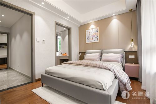 ??比起傳統(tǒng)區(qū)域封閉的硬朗,本案不設(shè)門阻隔的手法隨性自如,梳妝臺+衣帽間的過道型設(shè)計,滿足收納需求之余,空間感開闊。