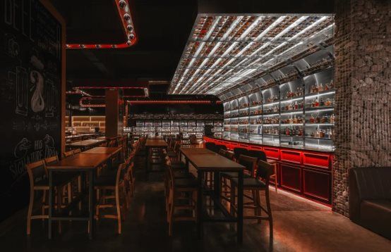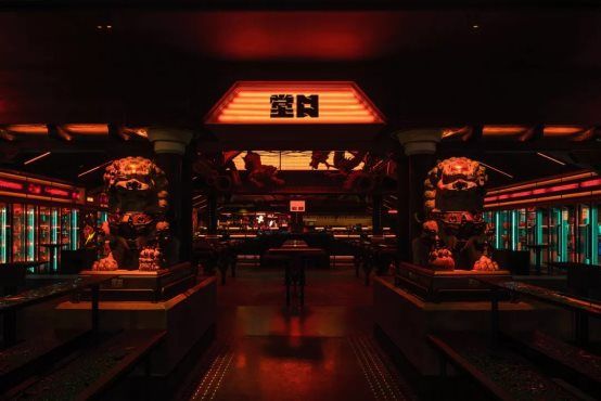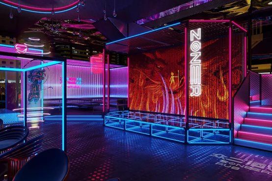 ??古建筑的構(gòu)架上大量使用了體現(xiàn)現(xiàn)代科技的材料和燈光,在外立面的大面積透明LED屏幕,讓在屏幕后面跑動的燈帶隱隱約約顯露出來,通場使用的燈條根據(jù)時(shí)間段變色,讓東方感更具神秘性,同時(shí)對應(yīng)功能至上的cyber世界中隨處可見的全息影像。碰撞融合的表現(xiàn)形式打破了常規(guī)“傳統(tǒng)”或“未來”給人的固定印象,并創(chuàng)造了獨(dú)特并多重的體驗(yàn)感。 ??2、賽博朋克風(fēng) 眾二酒館 ??眾所周知營造酒館氛圍的一大殺手锏即是運(yùn)用燈光映射在昏暗場景中碰撞出絢爛光景,如何成為暗夜中的炫目亮點(diǎn),由黑卡設(shè)計(jì)團(tuán)隊(duì)打造的坐落在重慶渝北的“眾二酒館”給出了完勝的作答。