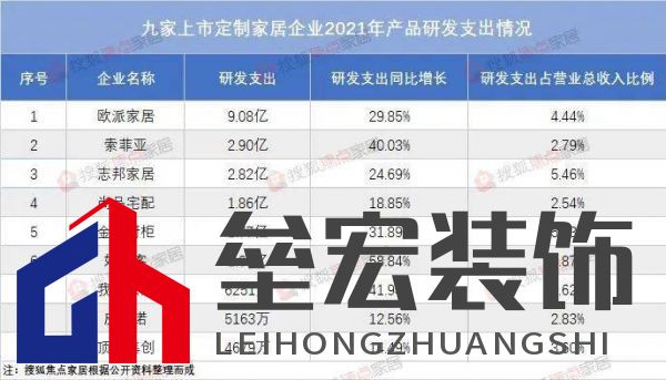 2022年廣州定制家居展剛結(jié)束不久,展會(huì)現(xiàn)場(chǎng),10000+款新產(chǎn)品遍地開(kāi)花,在這場(chǎng)盛況空前的產(chǎn)業(yè)圖景下,“提升產(chǎn)品競(jìng)爭(zhēng)力”作為各定制企業(yè)的發(fā)展共識(shí)。  隨著更年輕的一代成為家居消費(fèi)主力,審美與消費(fèi)觀念尤為豐富多樣,產(chǎn)品也在不斷升級(jí)與迭代,為了實(shí)現(xiàn)差異化競(jìng)爭(zhēng)優(yōu)勢(shì),近年來(lái)各定制家居企業(yè)普遍強(qiáng)化產(chǎn)品力的建設(shè)。針對(duì)2021年9家定制家居上市企業(yè)的研發(fā)投入、業(yè)務(wù)布局等,搜狐焦點(diǎn)家居整理分析。  一、歐派家居 公開(kāi)資料顯示,2021年歐派研發(fā)人員的數(shù)量超過(guò)2900人,研發(fā)支出9.08億,同比增長(zhǎng)29.85%,研發(fā)支出占營(yíng)業(yè)收入比例4.44%。年度研發(fā)投入在上市的九家定制家居企業(yè)中居首位。 歐派家居將產(chǎn)品研發(fā)擺在重要的戰(zhàn)略地位,堅(jiān)持用設(shè)計(jì)為企業(yè)賦能,在廚柜、衣柜等業(yè)務(wù)板塊都設(shè)有產(chǎn)品研發(fā)部門(mén),目前的產(chǎn)品開(kāi)發(fā)已從單品類過(guò)渡到全屋定制,實(shí)現(xiàn)了柜門(mén)墻配一體化設(shè)計(jì),用高度和諧統(tǒng)一的色彩搭配詮釋現(xiàn)代家居美學(xué)。
