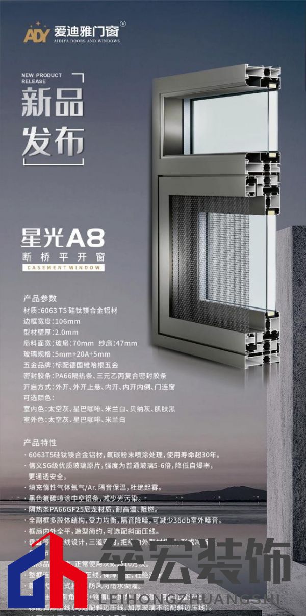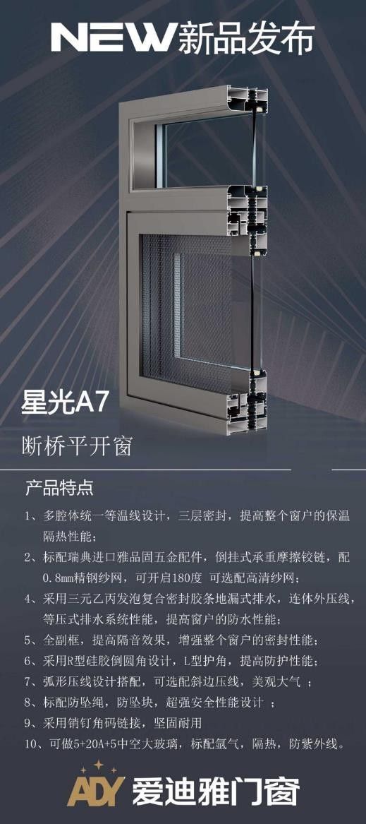 星光A7斷橋窗紗一體平開窗,邊框采用幕墻式結(jié)構,外形美觀,并且室外的那一面不易積塵,積水,長年以來易打理,清潔干凈。窗扇采用304不銹鋼摩擦鉸鏈,裝配0.8mm不銹鋼金剛紗,配備質(zhì)量優(yōu),使用久了不易磨損。這款產(chǎn)品時尚大氣,適合高端家裝市場。 榮耀V6斷橋平開窗,內(nèi)外平框,隱藏排水功能,其中設定科學水流路徑,雨天排水更加順暢,避免堵塞。設有高強度防護欄,由高密度鈦鎂鋁合金打造,既能防盜又能防護,保護家人安全。造型獨特,美觀大氣,整個空間都會顯得很寬敞,將自然美景收入家中。