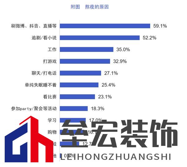 ??睡不“飽”睡不好 年輕人成熬夜“尖兵” ??報告由廣到細(xì),從面到點的層層撥露了當(dāng)代國民的睡眠現(xiàn)狀。調(diào)查顯示,一周7天中,公眾平均每周熬夜3.6天,只有8.6%的人從不熬夜。熬夜的原因五花八門、形形色色。刷微博、抖音、直播更是以近6成(59.1%)的比例高居榜首,追劇/看小說也以超過半數(shù)(52.2%)的比例排在前列。此外,工作也是導(dǎo)致熬夜的“原罪”,35%的人因為工作而熬夜;其中高職位、高收入水平群體熬夜問題尤其突出;廣告公關(guān)行業(yè)從業(yè)者睡眠質(zhì)量最差,比例高達(dá)36.6%。因?qū)W習(xí)而熬夜的也占比17%。值得一提的是,年輕人格外能熬,90后人群熬夜工作和熬夜娛樂的情況都比80后和70后更嚴(yán)重,堪稱熬夜“課代表”。