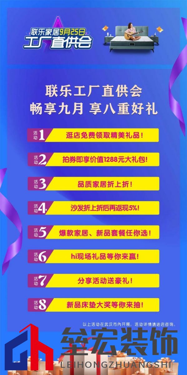超值家具任意購 八重盛惠驚喜連連 2022年9月25日,聯(lián)樂工廠直供節(jié),八重盛“惠”精彩不斷,福利多多。 【樂享禮遇】逛店免費領取精美禮品 活動期間到武漢市內(nèi)任意一家聯(lián)樂專賣店,可免費領取精美地墊一個。數(shù)量有限,送完即止。 【樂享大禮包】29.9 元拍券即享價值 1288 元大禮包 凡在聯(lián)樂小程序上以 29.9 元拍到本次活動優(yōu)惠券的顧客,即可獲得價值 1288 元豪華大禮包,包含加厚奶鍋一個、家居除螨服務及無門檻現(xiàn)金劵。 【樂享折扣】購正價商品享受折上折 活動期間如購正價商品,在正常市場折扣的基礎上再享額外折扣。 【樂享返現(xiàn)】購沙發(fā)折后再返現(xiàn) 活動期間購聯(lián)樂床具商品后再購買正價沙發(fā)商品,則正價沙發(fā)在享受完折上折之后,可再返現(xiàn)。 【樂享爆款套餐】爆款和套餐限量搶購 活動期間限量推出多款床具沙發(fā)爆款和套餐,限時搶購。價格驚艷眼球,搶到就是賺到。 【樂享 hi 現(xiàn)場】hi 現(xiàn)場贏取獎品 活動當天開啟多輪 hi 現(xiàn)場游戲互動,取勝免費贏取獎品,家居用品、電器等享不停。 【樂享分享禮】分享送豪禮 活動期間成交的顧客,總繳款額滿一定金額后,分享指定活動內(nèi)容至朋友圈或小區(qū)群,憑截圖可獲家電豪禮。 【樂享好運氣】抽床墊大獎 活動期間成交的顧客可獲抽獎券參與抽獎,免費床墊大獎等您抽取。