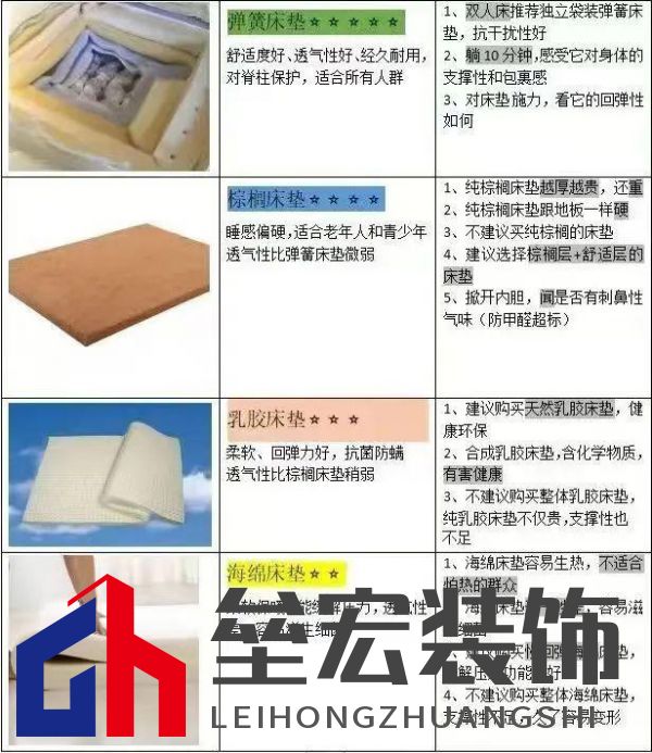 您在家居生活和家居選購中,是不是也有這樣那樣的糾結與苦惱? 其實這些問題也很好解決,小編教您四招輕松選床墊: 1、要選適合自己的,到店體驗很關鍵! 想要選擇一張好的床墊,首先要選擇適合自己體型的。每個人的脊椎曲線不一樣,睡眠習慣也不一樣,當您平躺在床墊上時,如果臂部沒有明顯下陷,腰部也沒有懸空,理論上這個床墊是適合的。 2、選床墊要明確自身的需求。 哪些是自身的需求呢? 比如年齡段,是青少年睡、中年人睡還是老年人睡,不同年齡段人群對床墊制作工藝的需求有很大差別。 再如身高體重。比如一個成年人如果他的體重基數(shù)比較大,選擇太軟的床墊會導致支撐力不足,睡醒后很有可能腰酸背痛。如果體重偏輕,卻選了一張較硬的床墊,那身體和床墊的貼合面不足,睡眠質量也是會大打折扣的。 再就是要結合自身身體特點及家庭情況。打個比方,如果消費者是一個容易過敏的體質,就需要考慮床墊是否有防螨抗菌功能,因為床墊一般使用年限比較長且很難徹底清潔打理,有防螨抗菌功能的床墊可以大大減少過敏的困擾。另外,買床墊還是要根據(jù)自己實際購買預算來選擇,這一點也是非常重要。無論別人怎么推銷,一定找準自己的定位,千萬別交智商稅啊。 3、搞清楚床墊類型,看看哪款才是你需要的 選擇床墊,健康環(huán)保非常重要,朝夕相伴的東西,馬虎不得。然后就是選擇床墊類型,彈簧床墊、棕櫚床墊、乳膠床墊、海綿床墊,它們各有利弊,小編整理了一張圖,方便大家快速對比了解!