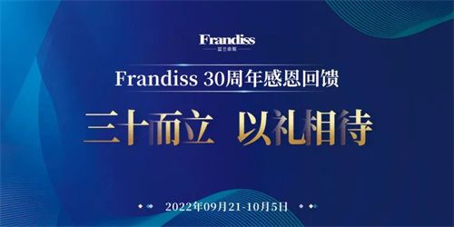 ??Frandiss(富蘭帝斯)三十周年之際 ??將舉行三十周年感恩回饋以及FB新品品鑒活動 ??本次活動將于9月21日-10月5號 ??活動以“而立,以禮相待”為主題 ??多重豪禮,超低折扣 ??感謝大家一直以來對富蘭帝斯的支持與厚愛 ??同時(shí)也將揭開FB新品的神秘面紗 ??帶來一場視覺上的饕殄盛宴 ??FB新品亮相,流光魅影 傾啟奢適 ??高端家居真正的意義 ??在于每一個經(jīng)得起細(xì)節(jié)考究的挑剔 ??在于其蘊(yùn)含獨(dú)有的非凡氣質(zhì) ??在于細(xì)節(jié)到紋理中的設(shè)計(jì) ??個性前衛(wèi),匠心藝術(shù) ??穿越曠野,尋覓內(nèi)心的真粹遐想, ??帶著對生命的敬畏,回歸自然 ??多種元素的碰撞與融合真正的顛覆之作 ??彰顯個性前衛(wèi)的生活主張 ??藍(lán)灰的色調(diào)里流淌著沉靜和美得貴族氣質(zhì) ??色彩的張力感,讓意象更為恢弘氣派 ??圓弧設(shè)計(jì)以殿堂為中心聚攏 ??有聚勢納財(cái)之意 ??蘊(yùn)藏著無限延伸之感 ??拉絲黃銅凸顯高貴氣質(zhì) ??優(yōu)雅的弧度線條 ??透露著典雅與端莊 ??頭層牛皮,舒適有品 ??觸感如同嬰兒肌膚般順滑 ??一筆一線精密車縫,成就毫厘之間的卓然美態(tài) ??以匠心藝術(shù),致敬經(jīng)典之作