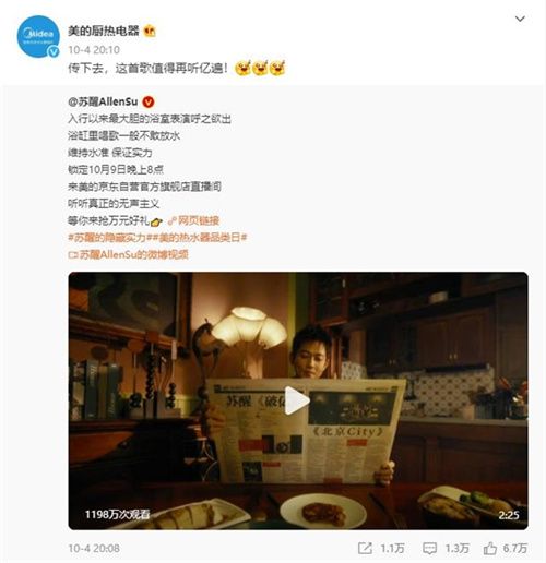 除了話題互動外,美的熱水器還攜手明星蘇醒共同演繹《最佳“隱”帝》,通過說唱的方式,再現(xiàn)了用戶生活沐浴中的煩惱,邀請網友一起解鎖萬有“隱”力,讓美好蘇醒!