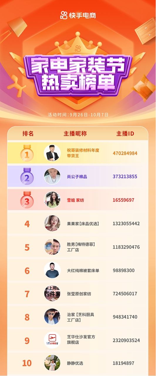 ??10月12日消息,快手電商家電家裝節(jié)隨著國(guó)慶假期結(jié)束圓滿收官,此次家電家裝節(jié)共促成GMV超5.5億,同比去年增長(zhǎng)了30%。參與活動(dòng)的家具、家居、家紡、家電等垂直行業(yè)商家均取得了優(yōu)異的大促成績(jī),家紡行業(yè)商家達(dá)成GMV超2.7億,家電行業(yè)商家達(dá)成GMV同比增長(zhǎng)了75%。 ??其中,祝哥裝修材料、尚公子棉品、雪姐家紡、果果家、勝男【梅特德菲】工廠店登上了熱賣榜前五,品牌商家芝華仕也擠進(jìn)了熱賣榜前十。