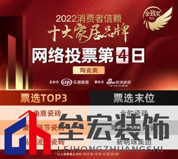 ??由樂居家居主辦,新浪家居承辦;CCTV《大國品牌》、家頁、家居質(zhì)量研究院、大國中居聯(lián)合主辦;全國工商聯(lián)家具裝飾業(yè)商會、中國建筑材料流通協(xié)會共同指導(dǎo);樂騰商學(xué)院、家頁智庫、家居質(zhì)量研究院提供研究支持。9月16日,第三屆《尋找優(yōu)質(zhì)消費者品牌--2022消費者信賴十大家居品牌》正式啟動。經(jīng)過企業(yè)申報、候選品牌公示環(huán)節(jié)后,于10月12日正式進入投票環(huán)節(jié)。>>點擊進入投票頁 ??陶瓷品類第四日戰(zhàn)報如下