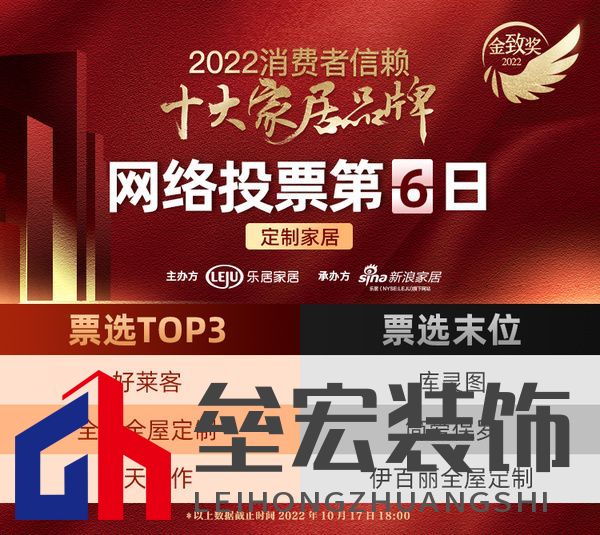 ??由樂(lè)居家居主辦,新浪家居承辦;CCTV《大國(guó)品牌》、家頁(yè)、家居質(zhì)量研究院、大國(guó)中居聯(lián)合主辦;全國(guó)工商聯(lián)家具裝飾業(yè)商會(huì)、中國(guó)建筑材料流通協(xié)會(huì)共同指導(dǎo);樂(lè)騰商學(xué)院、家頁(yè)智庫(kù)、家居質(zhì)量研究院提供研究支持。9月16日,第三屆《尋找優(yōu)質(zhì)消費(fèi)者品牌--2022消費(fèi)者信賴十大家居品牌》正式啟動(dòng)。經(jīng)過(guò)企業(yè)申報(bào)、候選品牌公示環(huán)節(jié)后,于10月12日正式進(jìn)入投票環(huán)節(jié)。>>點(diǎn)擊為定制家居類品牌投票 ??定制家居類第六日戰(zhàn)報(bào)如下