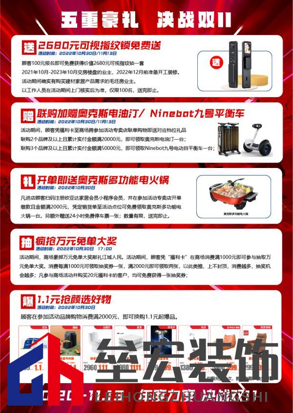 雙十一用實(shí)惠的價(jià)格和高品質(zhì)家居助力每一個(gè)消費(fèi)者完成家居計(jì)劃,展現(xiàn)出歐亞達(dá)光谷商場(chǎng)及各大品牌活力,并聯(lián)合裝修工長(zhǎng)、知名設(shè)計(jì)師和新浪家居媒體資源,共同為消費(fèi)者謀福利,一年一次,值得擁有! 歐亞達(dá)光谷商場(chǎng)福利大放送??