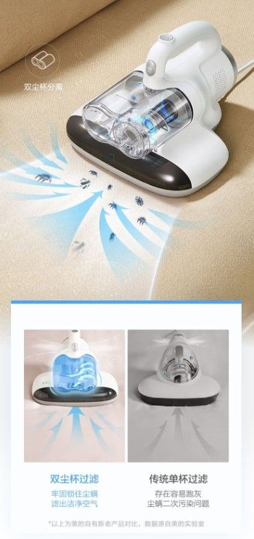 ??美的除螨儀強(qiáng)勢(shì)破局,強(qiáng)力除螨引領(lǐng)行業(yè)技術(shù)革新 ??除螨儀作為吸塵器核心技術(shù)的延伸,一直以來,核心技術(shù)都被戴森為首的歐美品牌占領(lǐng)技術(shù)高地。而吸力,則是戴森的殺手锏。然而消費(fèi)者為了除螨,卻要付4990元購買戴森吸塵器當(dāng)除螨儀用,上千的價(jià)格讓消費(fèi)者望而卻步,加上外國品牌技術(shù)的封鎖,讓國產(chǎn)除螨儀發(fā)展陷入技術(shù)桎梏。 ??美的在技術(shù)上勇于創(chuàng)新,敢當(dāng)“第一個(gè)吃螃蟹”的國內(nèi)領(lǐng)軍品牌。在對(duì)已有技術(shù)方案進(jìn)行全面探測(cè)對(duì)比后,積極需要除螨新的突破點(diǎn),找到一個(gè)有效的技術(shù)路徑,推出多款有效解決螨蟲問題的除螨儀,快速引爆市場(chǎng)。 ??2021年,美的首創(chuàng)行業(yè)內(nèi)擁有高壓電擊概念的除螨儀MX3,通過電擊瞬間產(chǎn)生3000V高壓,電離空氣產(chǎn)生負(fù)離子,負(fù)離子和細(xì)菌、螨蟲、塵埃結(jié)合,在有效殺死螨蟲的同時(shí),還能凈化空氣,被評(píng)為2021年度家電“好產(chǎn)品”代表。 ??如今,美的在MX5上推出全新一代除螨核心技術(shù)高壓電擊+雙杯過濾,徹底變革了純比拼吸力的時(shí)代,實(shí)現(xiàn)了除螨儀數(shù)十年歷史中的跨越式創(chuàng)新。 ??創(chuàng)新雙杯塵設(shè)計(jì),分濾塵螨潔凈不跑灰 ??除螨儀從核心結(jié)構(gòu)來講是個(gè)小吸塵器,吸塵器一大痛點(diǎn)是長(zhǎng)期使用后由于灰塵堵塞濾芯導(dǎo)致吸力大幅度下降。