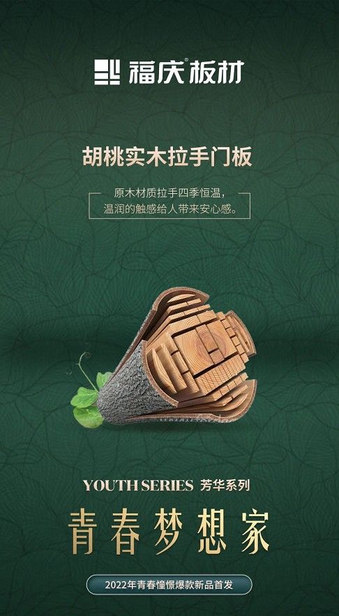 ??自然的色彩交錯出蓬勃的朝氣 ??感受青春記憶里的藤蔓長廊 ??讓人沉醉,愿流年可憶,未來可期 ??芳華系列設(shè)計靈感 ??來源于青春年華的色彩印象 ??樹木年輪描摹出產(chǎn)品的木紋肌理 ??將年輕而隨性的張力融合于空間中 ??胡桃實木拉手門板 ??胡桃實木拉手門板,原木材質(zhì)拉手四季恒溫,溫潤的觸感給人帶來安心感。