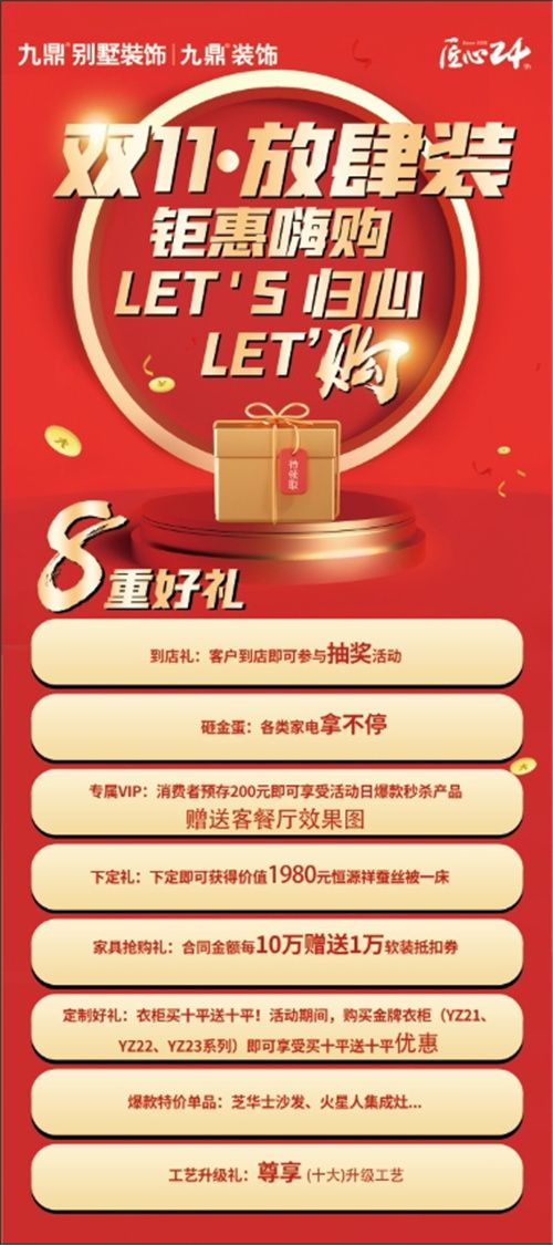 前言:安徽蕪湖九鼎裝飾、江蘇連云港九鼎裝飾、河北邯鄲九鼎裝飾、山東青島九鼎裝飾、浙江義烏九鼎裝飾、寧夏銀川九鼎裝飾、山東日照九鼎裝飾......等全國百余家分公司進行全國聯(lián)動,迎戰(zhàn)雙十一。 雙十一,某寶、某東、某多......劍拔弩張,大戰(zhàn)一觸即發(fā),打折、讓利、滿減、送券、直減!聰明的你,也似乎快要被滿屏的“便宜”沖昏頭腦.... 九鼎裝飾讓你跳出真香定律,拒絕套路,不用“剁手”,讓新家裝修變得更簡單!雙十一鉅惠力誠秒爆電商,真正雙十一的優(yōu)惠力度,不需要你動腦算了又算,各大家裝品牌直接給你活動價,與其他電商產(chǎn)品對比不在怕!讓裝修人不當(dāng)小韭菜,為您置家之路省省省! “雙11.放肆裝”百城聯(lián)動,千萬補貼, 九鼎裝飾雙11鉅惠活動來啦 11月1日至11月11日 九鼎裝飾百城聯(lián)動各城市公司 備足多重豪禮 整裝特享、家具搶購禮爆款特價單品、定制好禮、工藝升級禮…… 期待各位光臨