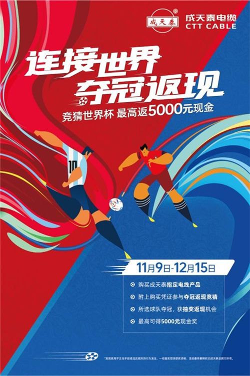 電線電纜行業(yè)要走向新高度,需要領(lǐng)軍品牌的開拓和引領(lǐng)。抓住這四年一屆,具有世界級超高關(guān)注度的難得機(jī)會。以創(chuàng)新營銷模式主動出擊,釋放品牌新的活力與能量,與世界杯同樣值得期待的還有——成天泰。 歷經(jīng)近40年穩(wěn)定高質(zhì)發(fā)展,以“6N耐用品質(zhì),領(lǐng)跑中國線纜標(biāo)準(zhǔn)”的深圳市成天泰電纜實(shí)業(yè)發(fā)展有限公司,用全新思維擁抱互聯(lián)網(wǎng)新經(jīng)濟(jì)時(shí)代,提前布局這場頂級體育盛事。2022年11月9日,將以先行者姿態(tài),首發(fā)開啟行業(yè)第1個(gè)世界杯主題營銷“連接世界 奪冠返現(xiàn)”世界杯有獎競猜活動。 屆時(shí),將借創(chuàng)意營銷戰(zhàn)役,引領(lǐng)中國電線電纜品牌破圈出擊,引爆市場贏得聲量,站在更大的舞臺去展示傳統(tǒng)制造行業(yè)的全新魅力與價(jià)值。 玩賺世界杯,猜中冠軍最高返5000元現(xiàn)金獎 諸神歸位,群雄爭奪,足壇烽煙起。來自全球最強(qiáng)的32支球隊(duì)蓄勢待發(fā)。王者之戰(zhàn),必將上演多次巔峰對決,燃燒每一位球迷的激情。 為世界杯喝彩,為廣大球迷朋友們助興。成天泰電纜,在電線的“繽紛色彩”與世界杯各國主隊(duì)“多彩球衣”之間找到共同特征,把32支球隊(duì),劃分為“紅、藍(lán)、黃、綠、黑、白”6大色彩戰(zhàn)營。用極具趣味的“色彩營銷”帶來一場與眾不同,精彩十足的“世界杯奪冠返現(xiàn)大競猜游戲”。 猜的輕松,贏的盡興。為讓更多消費(fèi)者可以享受到福利的暴擊,成天泰聯(lián)合200+門店一起送[金]喜,競猜世界杯,猜中冠軍最高可獲5000元現(xiàn)金大獎?;顒訉⒁曰痈偛隆F(xiàn)金獎勵,超高中獎率,竭力將世界杯的狂歡熱潮推向峰值。