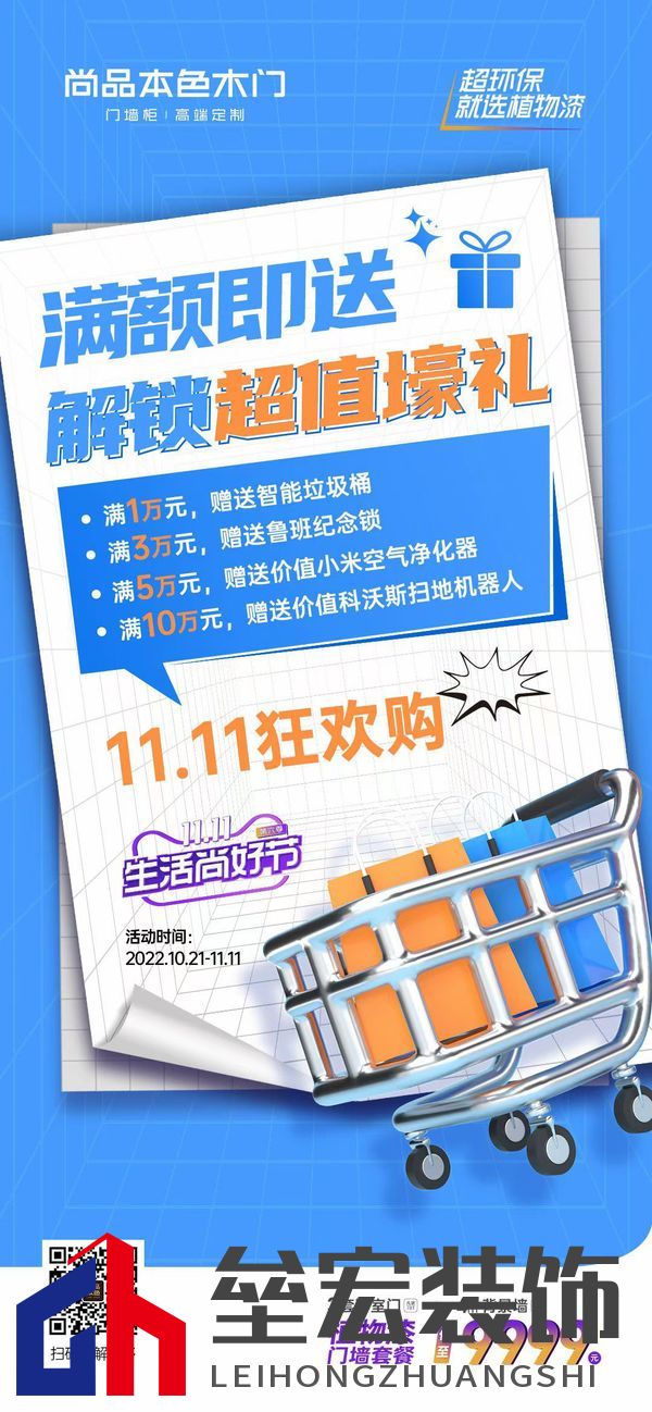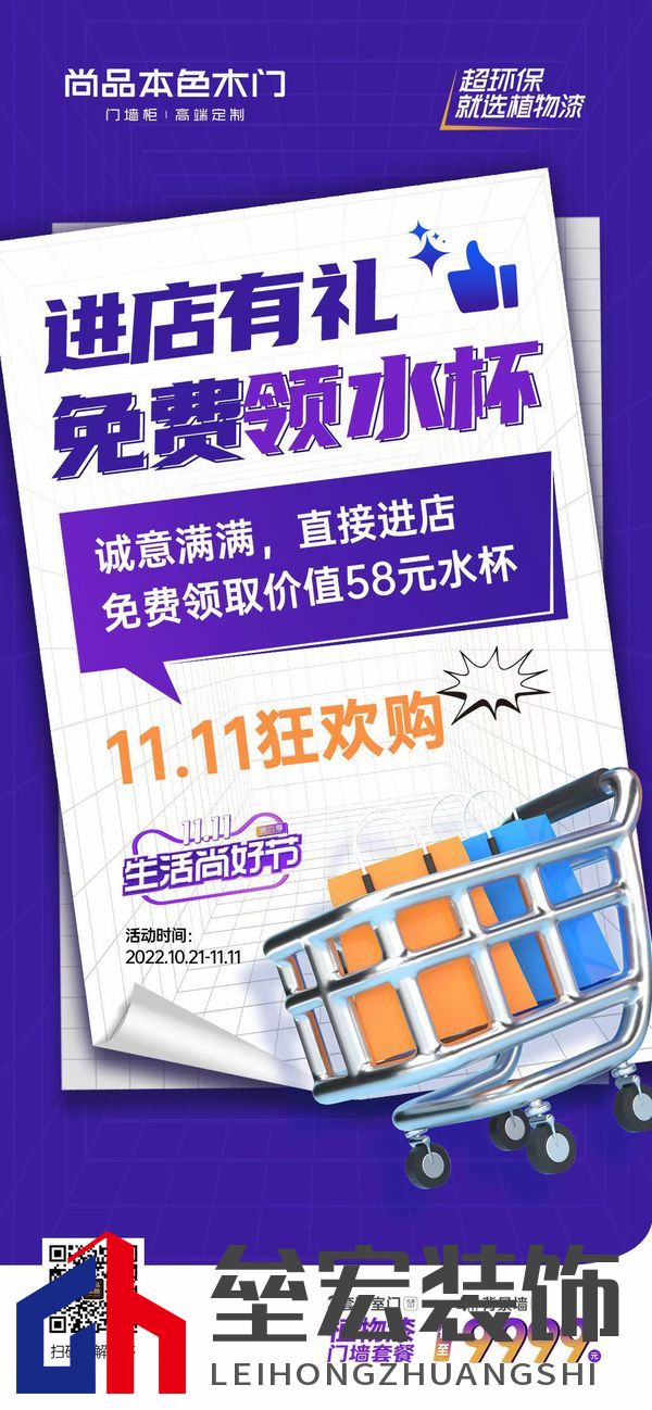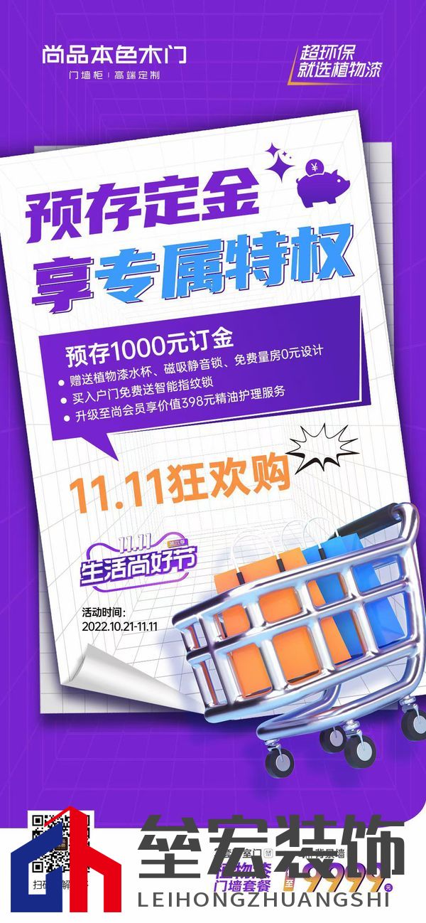 ??尚品本色雙11生活尚好節(jié)以滿滿誠(chéng)意,為消費(fèi)者帶來(lái)一系列驚喜福利,線下消費(fèi)者進(jìn)入門(mén)店即可直接領(lǐng)取精品水杯,預(yù)存100元定金即可享五重專屬特權(quán),植物漆水杯、靜音鎖、智能指紋鎖,免費(fèi)量房、0元設(shè)計(jì),精油護(hù)理服務(wù)下定直接送,福利滿滿,驚喜超多。