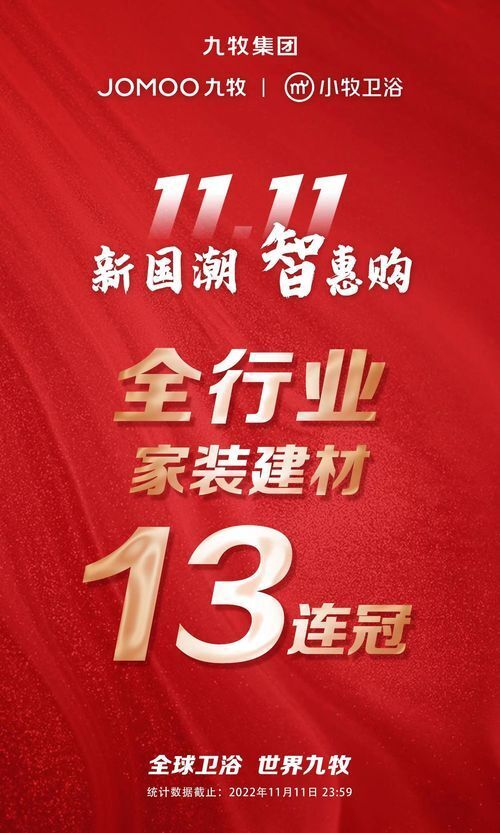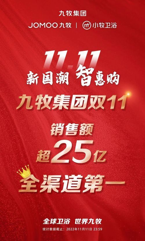 新國潮,智惠購 2022年雙11九牧再創(chuàng)佳績 銷售額累計超25億 全渠道第一 穩(wěn)奪全行業(yè)家裝建材“十三連冠” 一路領(lǐng)跑續(xù)寫傳奇,彰顯品牌實力!