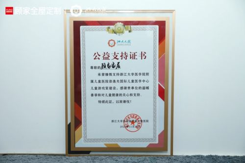 ??此次顧家家居對于醫(yī)院游戲室的公益支持打造以及公益關(guān)愛行動,獲得了醫(yī)院的認(rèn)可,也受到小朋友們及家長的歡迎,并榮獲浙江大學(xué)醫(yī)學(xué)院附屬兒童醫(yī)院頒發(fā)的感謝證書。
