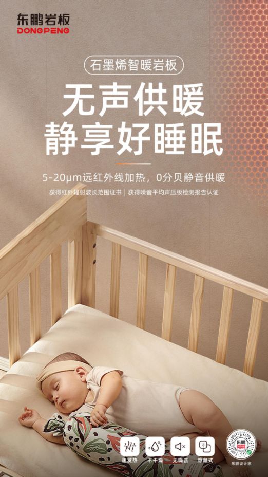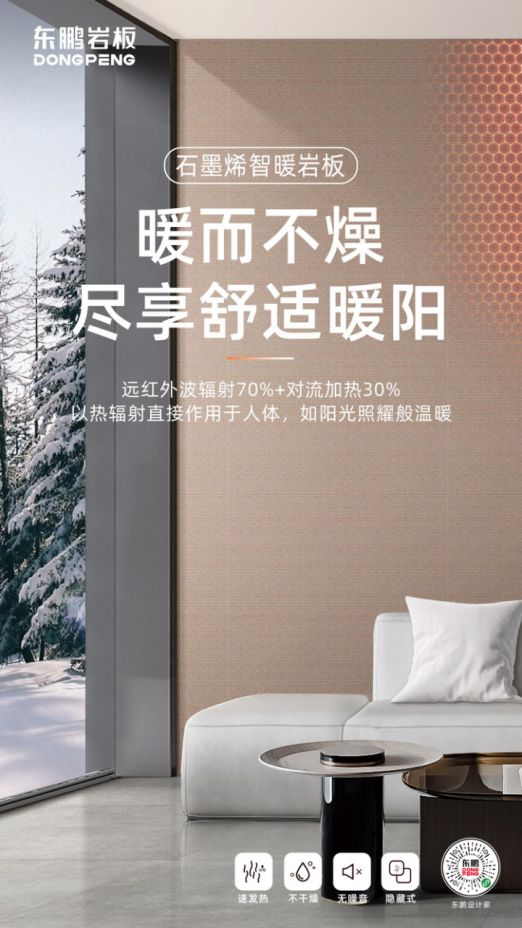 ??石墨烯智暖巖板還有強(qiáng)效抗菌、滅病毒、滅螨蟲的功效,通過釋放遠(yuǎn)紅外線,持續(xù)運(yùn)行對(duì)表面附著病毒的活性進(jìn)行抑制,從而達(dá)到抑菌的效果,金黃色葡萄球菌、大腸桿菌5小時(shí)殺滅率99%以上,能夠帶來潔凈的效果。 ??石墨烯智暖巖板不僅可以應(yīng)用在家居空間中,還可廣泛應(yīng)用于醫(yī)療空間上,例如,醫(yī)院病房空間、月子中心、老人中心、理療中心等場(chǎng)所,其均勻散熱并不會(huì)帶來任何聲音,輔佐理療與抑菌的性能,能夠?yàn)椴』紟硎孢m、安靜的康養(yǎng)環(huán)境。 ??“可持續(xù)發(fā)展”已成為全球性議題,東鵬持續(xù)以創(chuàng)新技術(shù)與產(chǎn)品踐行低碳發(fā)展戰(zhàn)略,解碼綠色可持續(xù)發(fā)展路徑,始終秉承著“融合科技藝術(shù)、締造美好人居”的品牌發(fā)展理念、積極踐行低碳綠色發(fā)展戰(zhàn)略,推動(dòng)行業(yè)高質(zhì)量發(fā)展。