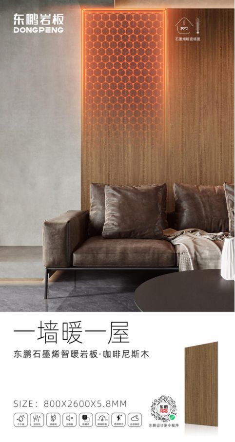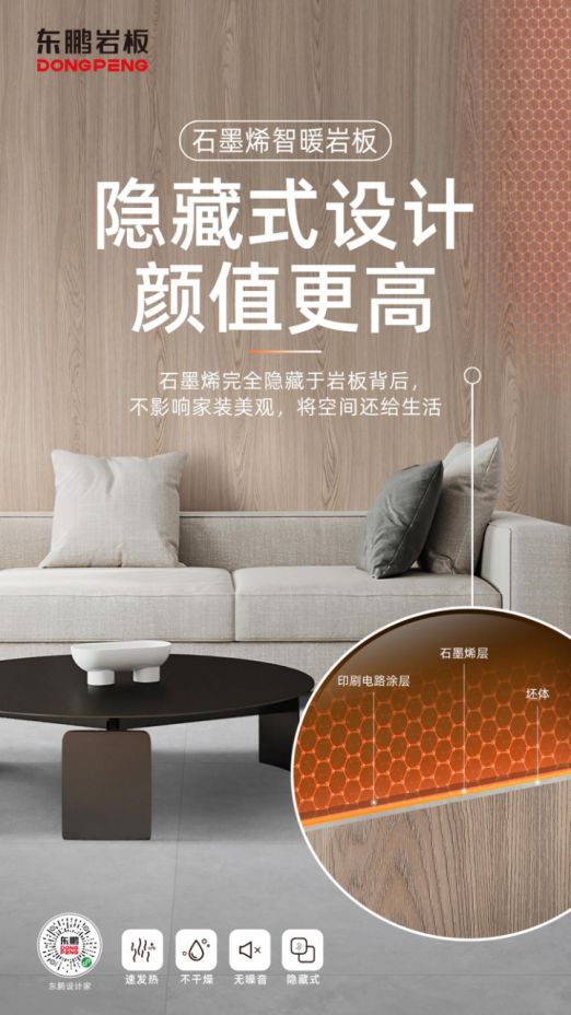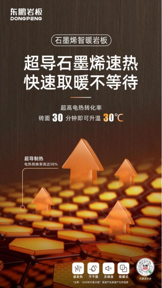 ??東鵬集團(tuán)創(chuàng)新性地將石墨烯材料應(yīng)用于巖板中,融合設(shè)計(jì)、藝術(shù)與可持續(xù)發(fā)展的理念,打造出暖冬黑科技 - 石墨烯智暖巖板,用科技創(chuàng)新為千萬家庭提供溫暖保障。 ??石墨烯,是一種具備高導(dǎo)熱性、高導(dǎo)電性、超薄性能、高強(qiáng)度、高熱穩(wěn)定等特點(diǎn)的新材料,它被廣泛應(yīng)用在高科技領(lǐng)域,例如航空航天,新能源汽車等,被認(rèn)為是一種未來革命性的材料。 ??東鵬集團(tuán)研發(fā)出石墨烯3D大面積超導(dǎo)制熱技術(shù)并運(yùn)用于智暖巖板中,將巖板、智能石墨烯發(fā)熱涂層、防水絕緣高密封裝三層保護(hù)設(shè)計(jì),打造出集裝飾性和功能性為一體的產(chǎn)品。 ??石墨烯巖板的誕生,重新定義了新時(shí)代的取暖方式。它可以是建筑材料,應(yīng)用于眾多家庭場(chǎng)景中,如墻面、地暖、桌椅、操作臺(tái)面等,它也可以是家電,高效發(fā)熱、暖而不燥、環(huán)保節(jié)能,功能超越瓷磚,真正做到一墻暖一屋。 ??高效制熱,超低能耗 ??東鵬石墨烯智暖巖板采用石墨烯3D大面積超導(dǎo)熱技術(shù),以超強(qiáng)導(dǎo)熱性能的石墨烯作為發(fā)熱源,發(fā)熱快、效率高、制熱均勻,電熱轉(zhuǎn)換效率高達(dá)98%以上,導(dǎo)熱系數(shù)高達(dá)5300W/mk,產(chǎn)品開啟后表面迅速升溫,30分鐘磚面即可升溫30℃,即開即用,溫暖更省電,享受不一樣的舒心。