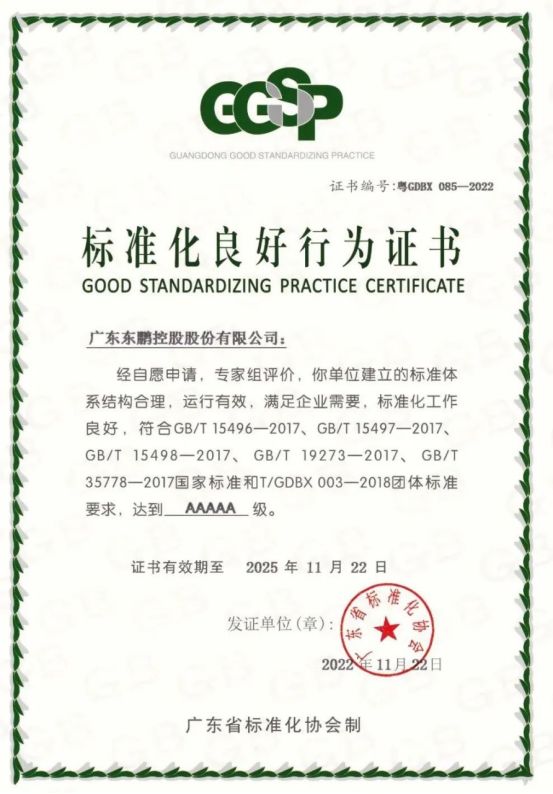??11月22日,廣東省標(biāo)準(zhǔn)化協(xié)會(huì)組織專家組對(duì)廣東東鵬控股股份有限公司的企業(yè)標(biāo)準(zhǔn)化工作進(jìn)行評(píng)價(jià)確認(rèn),依據(jù)評(píng)價(jià)準(zhǔn)則最終評(píng)為“標(biāo)準(zhǔn)化良好行為”AAAAA級(jí)企業(yè)。 ??企業(yè)標(biāo)準(zhǔn)化良好行為是指企業(yè)依據(jù)《企業(yè)標(biāo)準(zhǔn)體系》系列國(guó)家標(biāo)準(zhǔn)(GB/T 15496—2017、GB/T 15497—2017、GB/T 15498—2017、GB/T 19273—2017、GB/T 35778—2017)和廣東省標(biāo)準(zhǔn)化協(xié)會(huì)團(tuán)體標(biāo)準(zhǔn)T/GDBX 003—2018等標(biāo)準(zhǔn)要求,開展企業(yè)標(biāo)準(zhǔn)化工作,建立全新的企業(yè)標(biāo)準(zhǔn)體系并有效運(yùn)行,保證企業(yè)各項(xiàng)活動(dòng)有序開展并取得良好經(jīng)濟(jì)和社會(huì)效益。