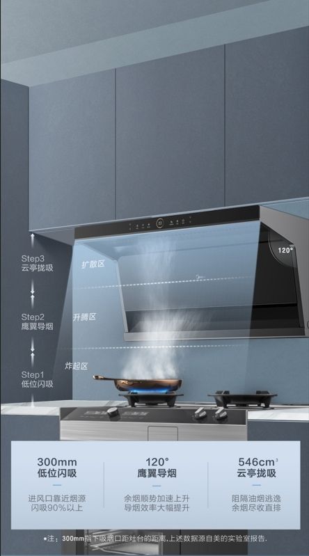 頂側(cè)雙吸凈煙大吸力,強勁吸排讓油煙無處可逃