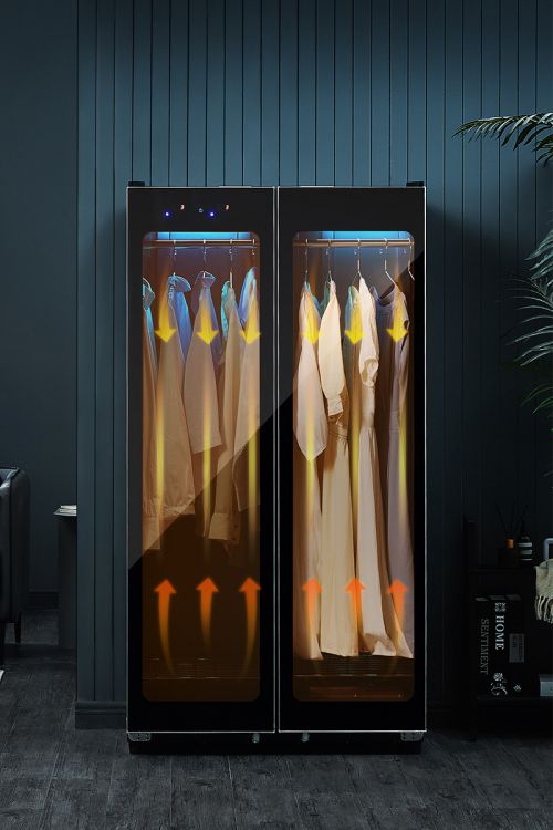 雙艙烘干的真香在于:當(dāng)只有幾件衣服需要烘干的時(shí)候,只需啟動(dòng)其中一個(gè)烘干艙,讓衣服在更小的密閉空間內(nèi)快速達(dá)到烘干的效果,實(shí)現(xiàn)高效節(jié)能的烘干。當(dāng)然,在比較多衣服需要烘干的情況下,可選擇把衣服按種類或厚薄程度分類后分別放置于兩個(gè)衣艙內(nèi)進(jìn)行同步烘干,自由掌握兩個(gè)烘干艙的干衣時(shí)間更便捷。對于有特殊烘干要求的的衣服,可將此類衣物放置在另一個(gè)衣艙內(nèi)單獨(dú)進(jìn)行烘干或消毒。 雙艙獨(dú)立工作,增加了烘干衣物的靈活性。 獨(dú)立無菌收納空間,寶寶之家必備 雙艙設(shè)計(jì)的好處不止更好地提高烘干效率,這款烘干機(jī)還能靈活變成無菌收納空間。 左室一般用作懸掛式干衣消毒,而右室可作為折疊無菌收納空間。右室設(shè)有多個(gè)層架安裝槽,可一次變成五層收納艙。這對于有小寶寶的家庭是極度友好的,把小寶寶的衣服、褲子、毛巾、襪子等衣物分類放置,一鍵開啟殺菌消毒功能,消毒完成后無需取出衣服,直接放置在右室內(nèi),需要給寶寶穿衣的時(shí)候再一件件取出,用除菌后的衣服給寶寶潔凈的呵護(hù)。