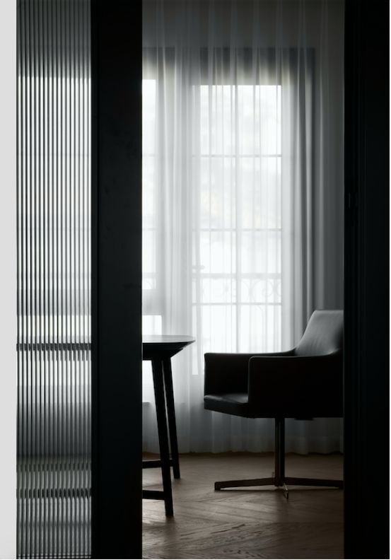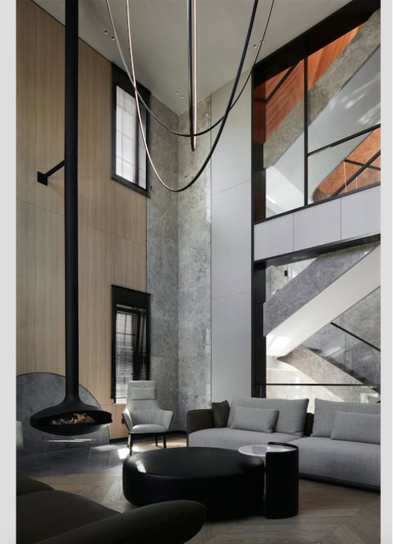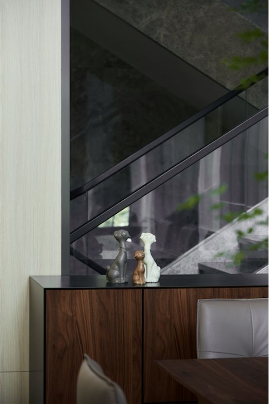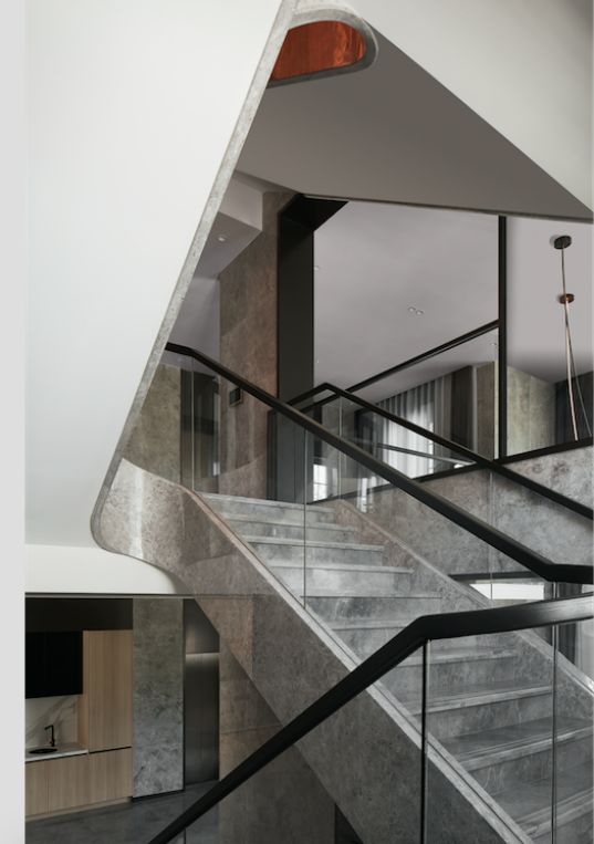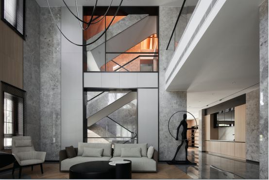 ??樓梯間將每一個(gè)樓層串連在一起。黑色的扶手、透明玻璃的材料以及大理石臺(tái)階,構(gòu)建了一個(gè)完美的觀景平臺(tái),臨近空間的形態(tài)一目了然。