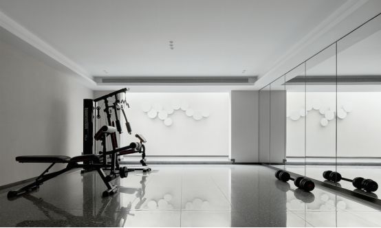 ??黑白交融為健身房注入不趨時(shí)的時(shí)髦感,沉穩(wěn)大氣的恰到好處。墻面的硅藻泥,不僅能形成漫反射弱化光源,保持濕度,也營(yíng)造出自然質(zhì)樸的別樣美感。