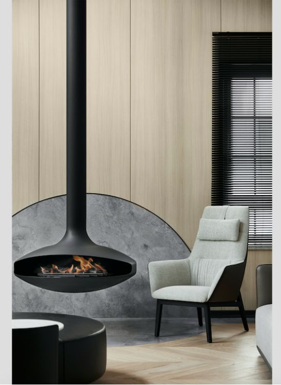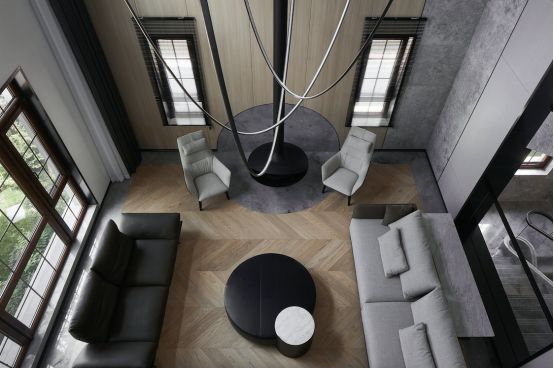 ??俯瞰一層客廳,陳設(shè)布局“對(duì)稱(chēng)”,以簡(jiǎn)單直白的平衡視覺(jué),娓娓道來(lái)空間的寧?kù)o雅致。幾何線條與圖形在家具和軟裝中互相呼應(yīng),真火壁爐和地板“大圓套小圓”既避免了真火外濺的不安全因素,又寓意家庭和睦,同心同力。