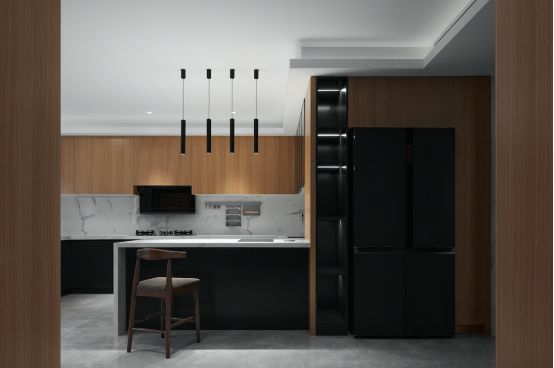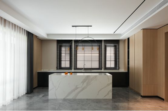 ??花園層的大理石中島構(gòu)成一個(gè)簡(jiǎn)約實(shí)用的西廚區(qū),與中廚和餐廳構(gòu)成聚餐宴客的完美場(chǎng)所,西廚一隅配有圓桌,滿(mǎn)足不同人數(shù)的用餐需求。 ??燈光映射到木色櫥柜上,明亮而不失溫度。整體的設(shè)計(jì)材質(zhì)在這里依然得到了延續(xù),每一個(gè)空間都因此有了關(guān)聯(lián)。