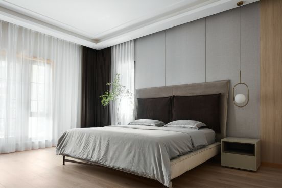 ??別墅中兩個(gè)主臥套房都以淺原木色、白色和灰色為主基調(diào)??臻g明凈,去繁從簡(jiǎn),白色輕紗的窗簾讓室內(nèi)變得飄逸和通透,床頭馬醉木綠色枝條的點(diǎn)綴,給人涼爽的好心情。