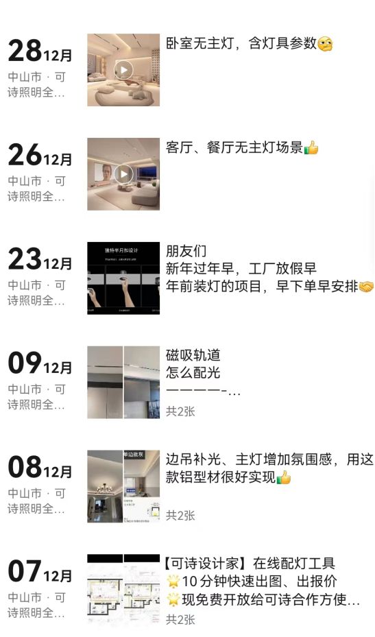 ??三、內容賦能 ??新媒體共享內容素材 ??KESHI可詩照明在小紅書、抖音、嗶哩嗶哩、快手等新媒體渠道強勢布局,累計吸粉超100W+。無論是官方號還是燈光設計師矩陣號,都持續(xù)產出能促進產品轉化的爆文、精品文,內容素材涵蓋圖片、視頻、文章等多種形式。KESHI可詩照明與合作伙伴共享新媒體內容素材,愿助力合作方有方向性地實現高質量的朋友圈內容營銷。