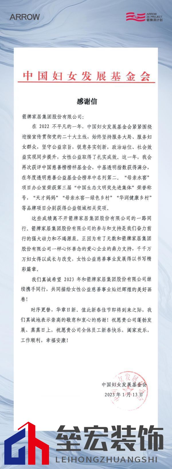 踐行社會責(zé)任,打造「箭牌澤計劃」回饋社會 據(jù)世界氣象組織在2022年底發(fā)布的首份《全球水資源狀況報告》,目前全球有36億人每年至少有一個月面臨供水不足,預(yù)計到2050年這一數(shù)字還將增至50億以上。 當(dāng)影響國計民生、關(guān)乎人類生存發(fā)展的水資源問題愈加嚴(yán)峻,越來越多來自社會各界的群體、組織開始投身其中,探尋解決之道,逐漸凝成了獨特的公益力量。而箭牌家居集團(tuán)打造的公益品牌-「箭牌澤計劃」正是以回饋社會為己任,努力踐行社會責(zé)任。  誕生自2022年的「箭牌澤計劃」延續(xù)了箭牌家居的基因,通過創(chuàng)新化的探索,挖掘出品牌公益道路的新模式:以衛(wèi)生和環(huán)保為抓手,凝聚各方細(xì)水長流的公益力量,以產(chǎn)品、活動、資金等多種形式將關(guān)愛輻射至多個群體,并配合品牌科技驅(qū)動打造“可持續(xù)的生活解決方案”。這其中便涵蓋對“水”公益的落地行動。 秉承著讓水資源短缺地區(qū)的孩子也可以實現(xiàn)熱水澡自由的信念,2022年8月,箭牌家居聯(lián)合廣東省婦女兒童基金會,以現(xiàn)金捐贈的形式助力內(nèi)蒙古正藍(lán)旗那日圖蘇木烏日圖嘎查“母親水窖——集中供水工程”援建項目,幫助偏遠(yuǎn)干旱地區(qū)婦女和群眾解決飲水困難的問題,在整個過程中倡導(dǎo)全社會踐行節(jié)水行為、實現(xiàn)更為環(huán)保的生活方式,內(nèi)蒙古“母親水窖”項目成為中國缺水地區(qū)萬千家庭生活的希望與幸福源泉。 在傳遞善意的道路上,點滴付出亦會被看見。近日,箭牌家居「箭牌澤計劃」對“母親水窖——集中供水工程”援建項目的公益行動收到了中國婦女發(fā)展基金會的感恩回饋。一封誠摯的感謝信,道盡中國婦女發(fā)展基金會與箭牌家居戮力同心、持續(xù)發(fā)力女性公益事業(yè)的初心。  用品牌力量發(fā)起公益號召,做有溫度有擔(dān)當(dāng)?shù)钠髽I(yè) 事實上,箭牌家居一直走在社會公益的道路上,踐行著企業(yè)應(yīng)有的社會責(zé)任。2021年-2022年期間,箭牌家居曾聯(lián)合香江社會救助基金會,援建重點貧困地區(qū)學(xué)校,陸續(xù)為湖南、廣東內(nèi)十所在建小學(xué)捐贈衛(wèi)生間瓷磚、坐便器、蹲便器、立柱盆、龍頭等潔具產(chǎn)品,幫助當(dāng)?shù)馗纳平逃h(huán)境,提升相關(guān)衛(wèi)生體驗標(biāo)準(zhǔn)和兒童衛(wèi)生常識;還攜手廣東省婦女兒童基金會,聚焦對特殊母親及其家庭的關(guān)懷和扶持,為50個特殊家庭提供潔具產(chǎn)品,幫助特殊家庭解決健康生活的難題;此外,2022年年末,箭牌家居更是將公益的核心聚焦老年人群體,聯(lián)合天貓、中國老年學(xué)會和老年醫(yī)學(xué)學(xué)會共同發(fā)起“黃扶手計劃”,向社會送出5萬個適老扶手,為老年人群體送去精神和生活的支柱。  于無聲處傳遞愛意,于細(xì)節(jié)處貼心守護(hù)。相信未來,箭牌家居將持續(xù)公益之路,通過「箭牌澤計劃」讓善意觸達(dá)更廣泛的群體,用品牌的力量發(fā)起全社會的公益號召,做有溫度有擔(dān)當(dāng)?shù)钠髽I(yè)。