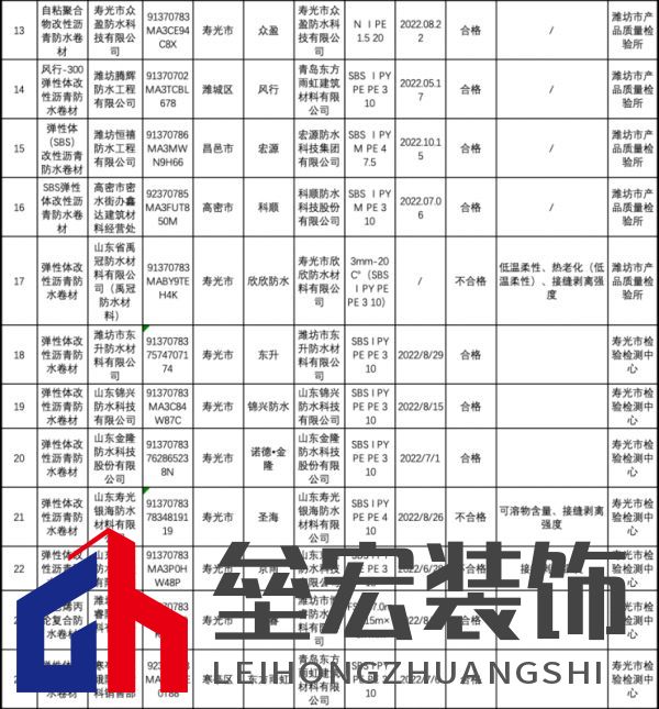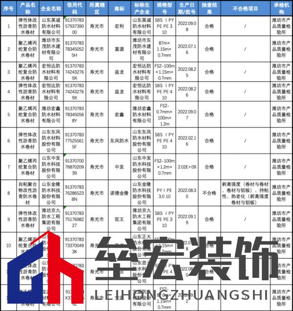 近日,山東省濰坊市市場(chǎng)監(jiān)督管理局網(wǎng)站發(fā)布2022年第三批建筑防水卷材產(chǎn)品質(zhì)量市級(jí)監(jiān)督抽查結(jié)果。2022年9月至11月,濰坊市市場(chǎng)監(jiān)督管理局組織開展了第三批產(chǎn)品質(zhì)量市級(jí)監(jiān)督抽查。本次共抽查了全市30家企業(yè)的31批次建筑防水卷材產(chǎn)品。其中,生產(chǎn)領(lǐng)域24家企業(yè)25批次產(chǎn)品,流通領(lǐng)域6家企業(yè)6批次產(chǎn)品。抽查發(fā)現(xiàn)4家企業(yè)的4批次產(chǎn)品不符合相關(guān)標(biāo)準(zhǔn)的要求,不合格項(xiàng)目涉及可溶物含量、接縫剝離強(qiáng)度、低溫柔性、熱老化、剝離強(qiáng)度、持粘性等。 本次抽查依據(jù)GB 18242-2008《彈性體改性瀝青防水卷材》等標(biāo)準(zhǔn)要求,對(duì)彈性體改性瀝青防水卷材產(chǎn)品的可溶物含量、耐熱性、低溫柔性、不透水性、拉力、延伸率、熱老化(拉力保持率)、熱老化(延伸率保持率)、熱老化(低溫柔性)、熱老化(尺寸變化率)、熱老化(質(zhì)量損失)、滲油性、接縫剝離強(qiáng)度等13個(gè)項(xiàng)目進(jìn)行了檢驗(yàn);依據(jù)GB/T 18173.1-2012《高分子防水材料 第1部分:片材》等標(biāo)準(zhǔn)要求,對(duì)高分子防水材料產(chǎn)品的拉伸強(qiáng)度(常溫)、拉伸強(qiáng)度(高溫)、拉斷伸長(zhǎng)率(常溫)、拉斷伸長(zhǎng)率(低溫)、撕裂強(qiáng)度、不透水性、低溫彎折、加熱伸縮量、熱空氣老化(拉伸強(qiáng)度保持率)、熱空氣老化(拉斷伸長(zhǎng)率保持率)、耐堿性(拉伸強(qiáng)度保持率)、耐堿性(拉斷伸長(zhǎng)率保持率)、復(fù)合強(qiáng)度(FS2型表層與芯層)等13個(gè)項(xiàng)目進(jìn)行了檢驗(yàn);依據(jù)GB 23441-2009《自粘聚合物改性瀝青防水卷材》等標(biāo)準(zhǔn)要求,對(duì)自粘聚合物改性瀝青防水卷材產(chǎn)品的拉伸性能(拉力)、拉伸性能(最大拉力時(shí)延伸率)、拉伸性能(瀝青斷裂延伸率)、拉伸性能(拉伸時(shí)現(xiàn)象)、釘桿撕裂強(qiáng)度、耐熱性、低溫柔性、不透水性、剝離強(qiáng)度、滲油性、持粘性、熱老化(拉力保持率)、熱老化(最大拉力時(shí)延伸率)、熱老化(低溫柔性)、熱老化(剝離強(qiáng)度卷材與鋁板)、熱老化(尺寸穩(wěn)定性)、熱穩(wěn)定性、可溶物含量、自粘瀝青再剝離強(qiáng)度等19個(gè)項(xiàng)目進(jìn)行了檢驗(yàn);依據(jù)GB 12952-2011《聚氯乙烯(PVC)防水卷材》等標(biāo)準(zhǔn)要求,對(duì)聚氯乙烯(PVC)防水卷材產(chǎn)品的中間胎基上面樹脂層厚度、拉伸性能(最大拉力)、拉伸性能(拉伸強(qiáng)度)、拉伸性能(最大拉力時(shí)延伸率)、拉伸性能(斷裂伸長(zhǎng)率)、熱處理尺寸變化率、低溫彎折性、不透水性、抗沖擊性能、抗靜態(tài)荷載、直角撕裂強(qiáng)度、梯形撕裂強(qiáng)度、吸水率、接縫剝離強(qiáng)度等14個(gè)項(xiàng)目進(jìn)行了檢驗(yàn)。 抽查發(fā)現(xiàn)4家企業(yè)的4批次產(chǎn)品不符合相關(guān)標(biāo)準(zhǔn)的要求,不合格項(xiàng)目涉及可溶物含量、接縫剝離強(qiáng)度、低溫柔性、熱老化、剝離強(qiáng)度、持粘性等。具體抽查結(jié)果如下: 2022年第三批建筑防水卷材產(chǎn)品質(zhì)量市級(jí)監(jiān)督抽查結(jié)果匯總表    來(lái)源:中國(guó)建筑防水協(xié)會(huì) |