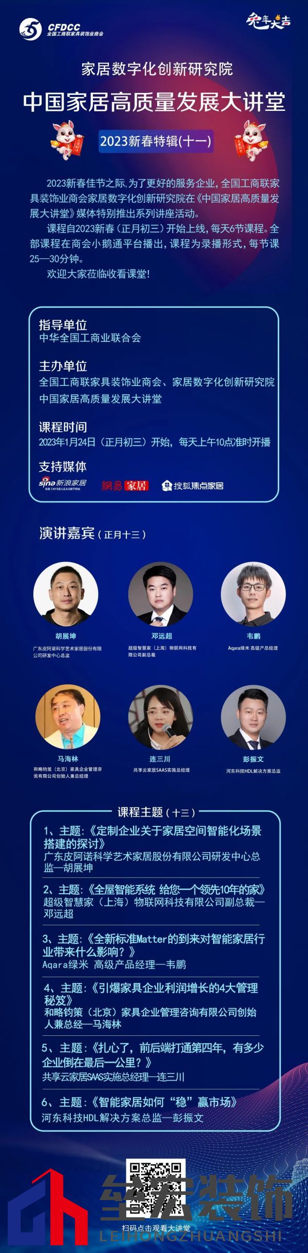 ??值此新春佳節(jié)之際,由全國工商聯(lián)家具裝飾業(yè)商會(huì)家居數(shù)字化創(chuàng)新研究院主辦的2023“中國家居高質(zhì)量發(fā)展大講堂”于正月初三上午10點(diǎn)正式上線播出!《中國家居高質(zhì)量發(fā)展大講堂》自2022年春節(jié)推出以來,深受行業(yè)的好評(píng),最多時(shí)一場(chǎng)十幾萬人在線收看。 ??今年的大講堂課程設(shè)計(jì),密切結(jié)合家居行業(yè)實(shí)際,選擇行業(yè)亟待解決的、重點(diǎn)關(guān)注的、對(duì)行業(yè)發(fā)展具有深刻影響的內(nèi)容,特別邀請(qǐng)行業(yè)專家授課,包括了四大熱點(diǎn)主題:數(shù)字化轉(zhuǎn)型案例分享、元宇宙技術(shù)與應(yīng)用、家居整裝與供應(yīng)鏈、智能家居技術(shù)講座。 ??正月十三的演講主題如下圖,歡迎大家掃描二維碼收看課堂!
