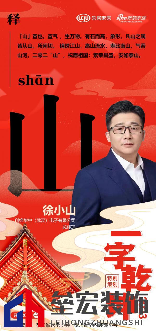 在新浪家居“2023一字乾坤”活動中,創(chuàng)維華中(武漢)電子有限公司總經(jīng)理徐小山:「山」宣也。宣氣,生萬物。有石而高,象形。凡山之屬皆從山。所閑切。 錦繡江山,高山流水,壽比南山、氣吞山河。二零二“山”,祝愿祖國:繁榮昌盛,安如泰山。 “以漢字賦能湖北家居企業(yè),彰顯厚積薄發(fā)之力”,以單字抒寫了各家企業(yè)及媒體的新年愿景與發(fā)展信條,領(lǐng)略楚風(fēng)漢韻下湖北家居人砥礪向前,揚(yáng)帆未來的決心與動力,情暖兔歲,新啟華章。 |
