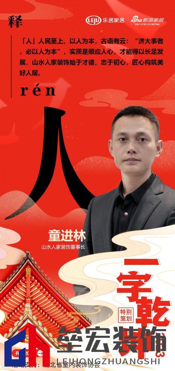 在新浪家居“2023一字乾坤”活動(dòng)中,山水人家裝飾董事長童進(jìn)林:「人」人民至上、以人為本,古語有云:“濟(jì)大事者,必以人為本”,實(shí)質(zhì)是順應(yīng)人心,才能得以長足發(fā)展,山水人家裝飾始于才德,忠于初心,匠心構(gòu)筑美好人居。 “以漢字賦能湖北家居企業(yè),彰顯厚積薄發(fā)之力”,以單字抒寫了各家企業(yè)及媒體的新年愿景與發(fā)展信條,領(lǐng)略楚風(fēng)漢韻下湖北家居人砥礪向前,揚(yáng)帆未來的決心與動(dòng)力,情暖兔歲,新啟華章。 |