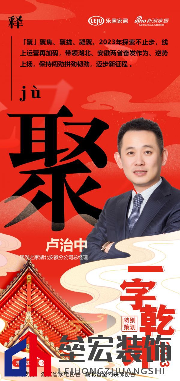 在新浪家居“2023一字乾坤”活動中,居然之家湖北安徽分公司總經(jīng)理盧治中:「聚」聚焦、聚攏、凝聚。2023年探索不止步,線上運營再加碼,帶領湖北、安徽兩省奮發(fā)作為、逆勢上揚,保持闖勁拼勁韌勁,邁步新征程 。 “以漢字賦能湖北家居企業(yè),彰顯厚積薄發(fā)之力”,以單字抒寫了各家企業(yè)及媒體的新年愿景與發(fā)展信條,領略楚風漢韻下湖北家居人砥礪向前,揚帆未來的決心與動力,情暖兔歲,新啟華章。 |