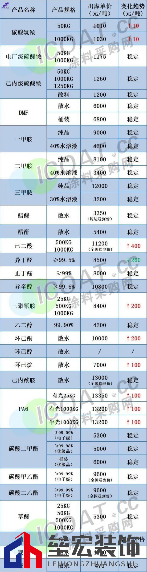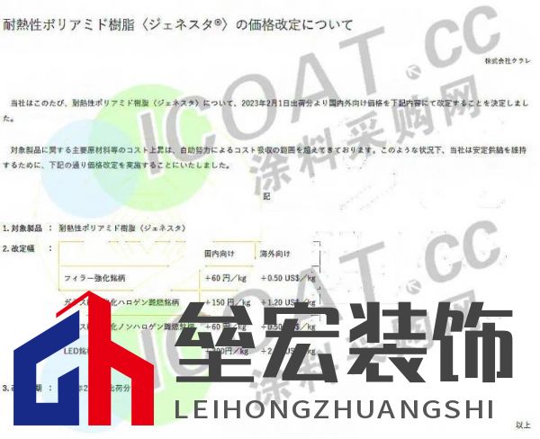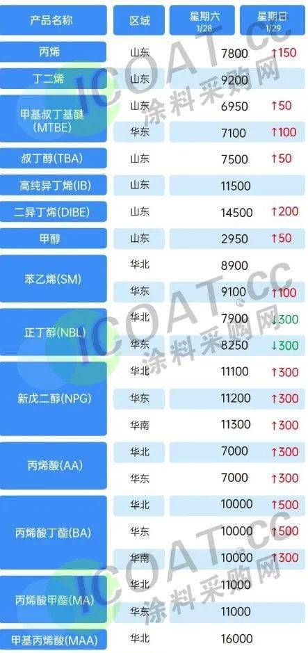 (上海華誼新材料1月29日產(chǎn)品報價表) 華魯恒升己二酸掛牌價調(diào)漲400元,報11200元/噸送到。 石家莊柏坡正元液氨調(diào)漲30元,報4250元/噸。 利華益維遠(yuǎn)化學(xué)苯酚產(chǎn)品出廠價格上調(diào)100元/噸,執(zhí)行7800元/噸。 大連恒力丁二烯價格上調(diào)200元/噸至8710元/噸。 神華寧煤丁二烯價格上調(diào)300元/噸至8400元/噸。 山東地區(qū)醋酸企業(yè)周邊送到價在3050元/噸左右,假期市場價格上調(diào)100元/噸。 利華益異辛醇價格上漲500元/噸,報10400元/噸。 華魯恒升異辛醇價格上漲500元/噸,報10800元/噸。 利華益維遠(yuǎn)化學(xué)丙酮產(chǎn)品出廠價格上調(diào)200元/噸執(zhí)行5200元/噸。 上海巴斯夫TDI 1月結(jié)算價19300元/噸,2月掛牌25000元/噸,環(huán)比上調(diào)4000/噸。 可樂麗株式會社發(fā)布調(diào)價通知,自2023年2月1日起,填料強(qiáng)化品種和玻璃纖維強(qiáng)化鹵素阻燃品種國內(nèi)漲60日元/kg,國外市場漲0.5美元/kg(約合人民幣3392元/噸);玻璃纖維強(qiáng)化鹵素阻燃品種國內(nèi)漲150日元/kg,國外市場漲1.2美元/kg(約合人民幣8184元/噸);LED品種國內(nèi)漲300日元/kg,國外市場漲2.3美元/kg(約合人民幣15604元/噸)。  信息來源:涂料采購網(wǎng) 封面圖:立邦官網(wǎng) |