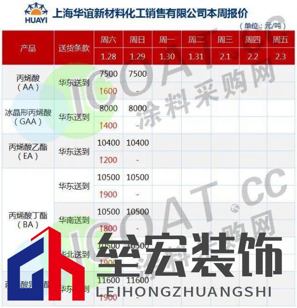 (萬華化學(xué)1月29日產(chǎn)品報價表) 上海華誼新材料價格表顯示,與年初價格相比,丙烯酸上漲600元/噸,冰晶形丙烯酸上漲400元/噸,丙烯酸乙酯上漲200元/噸,丙烯酸丁酯上漲900元/噸,丙烯酸異丁酯上漲900元/噸。
