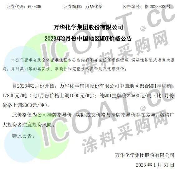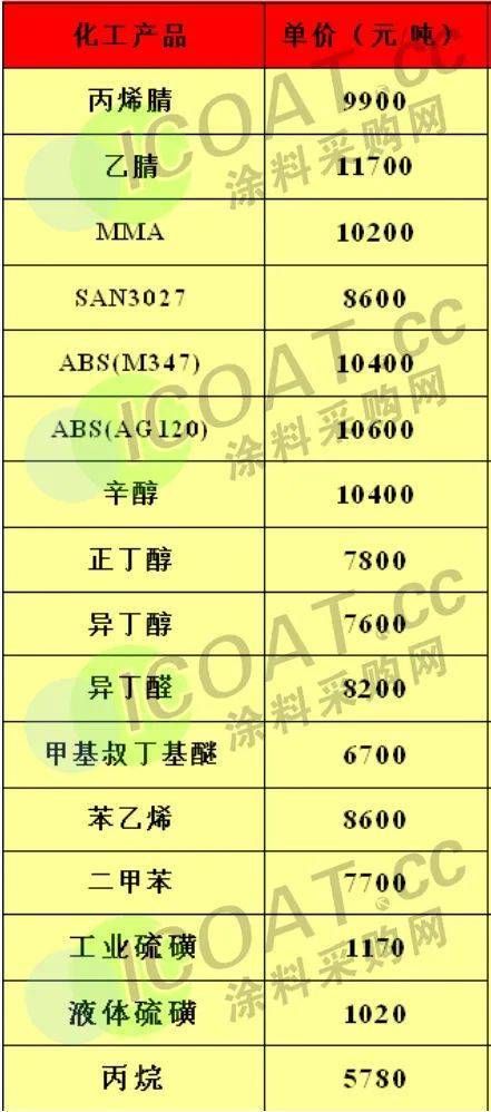 據(jù)涂料采購網(wǎng)了解,乳液產(chǎn)業(yè)鏈上的甲苯、二甲苯、丙二醇、乙二醇二醚、苯乙烯等均出現(xiàn)價格上漲的情況,最高上漲超過10%;樹脂產(chǎn)業(yè)鏈上的液體環(huán)氧樹脂、新戊二醇均有上漲,雙酚A也在近幾日以噸價上漲百元的速度迎頭趕上;鈦白粉行業(yè)已有龍頭企業(yè)報價上調(diào),廠家當(dāng)前仍處于檢修中,行業(yè)供應(yīng)小幅收緊。2023年,在原材料價格上漲的趨勢之下,涂料企業(yè)的發(fā)展重點(diǎn)將會放在降本增效方面。具體原材料情況整合如下: 近日,萬華化學(xué)發(fā)布公告,自2023年2月份開始,公司中國地區(qū)聚合MDI掛牌價17800元/噸 (比1月份價格上調(diào)1000元/噸); 純MDI掛牌價22500元/噸 (比1月份價格上調(diào)2000元/噸)。  而在此前, 巴斯夫宣布對東盟和南亞地區(qū)的MDI基礎(chǔ)產(chǎn)品進(jìn)行漲價, 漲價幅度為300美元/噸(約合人民幣2026元/噸),即日起生效,這也揭開了近期MDI產(chǎn)業(yè)的上漲序幕。  據(jù)公開數(shù)據(jù),印度地區(qū)目前已有MDI廠家對聚合MDI報盤上調(diào)至1850美元/噸,相較于中國農(nóng)歷新年前的1700美元/噸上漲150美元/噸。 萬華、利華益、華魯恒升等龍頭領(lǐng)漲,40多種化工品價格調(diào)漲! 春節(jié)之后剛剛開工,化工產(chǎn)業(yè)也在一片呼聲中開始拉漲,40多種化工品價格上漲。 丁二烯目前報價8845元/噸,較月初報價上漲1603.75元/噸,漲幅22.15%; 異丁醛目前報價7933.33元/噸,較月初報價上漲1366.66元/噸,漲幅20.81%; 丙烷目前報價6137.5元/噸,較月初報價上漲1055元/噸,漲幅20.76%; MIBK目前報價17733.33元/噸,較月初報價上漲2966.66元/噸,漲幅20.09%; 1,4-丁二醇目前報價11290元/噸,較月初報價上漲1510元/噸,漲幅15.44%; 甲苯目前報價6590元/噸,較月初報價上漲670元/噸,漲幅11.32%; 己內(nèi)酰胺目前報價11966.67元/噸,較月初報價上漲900元/噸,漲幅8.13%; 加氫苯目前報價7100元/噸,較月初報價上漲533.33元/噸,漲幅8.12%; 純苯目前報價7015.5元/噸,較月初報價上漲483.33元/噸,漲幅7.40%; PX目前報價8000元/噸,較月初報價上漲550元/噸,漲幅7.38%; 二甲苯(溶劑級)目前報價7375元/噸,較月初報價上漲500元/噸,漲幅7.27%; 苯乙烯目前報價8516.67元/噸,較月初報價上漲516.67元/噸,漲幅6.46%; 丙二醇目前報價7866.67元/噸,較月初報價上漲466.67元/噸,漲幅6.31%; 三氯甲烷目前報價2400元/噸,較月初報價上漲137.5元/噸,漲幅6.08%; 環(huán)己酮目前報價9690元/噸,較月初報價上漲470元/噸,漲幅5.10%; 碳酸二甲酯目前報價4900元/噸,較月初報價上漲233.33元/噸,漲幅5.00%。 2023年1月部分化工品漲價榜 (單位:元/噸)  (以上數(shù)據(jù)來源于涂料采購網(wǎng)信息中心,如有差池請以實(shí)際數(shù)據(jù)為準(zhǔn)!) 除此之外,多家龍頭化工企業(yè)的報價單顯示,目前的單噸報價已經(jīng)比年初上漲了近千元。部分在1月價格維穩(wěn)甚至下滑的化工品也在月末出現(xiàn)了上漲的苗頭,似乎要抓住開工的利好時機(jī),達(dá)成逆勢翻身的目的。 利華益集團(tuán)報價表顯示,與年初價格相比,丙烯腈上漲400元/噸,MMA上漲100元/噸,辛醇上漲900元/噸,異丁醇上漲200元/噸,異丁醛上漲200元/噸,甲基叔丁基醚上漲100元/噸,苯乙烯上漲500元/噸,丙烷上漲780元/噸。