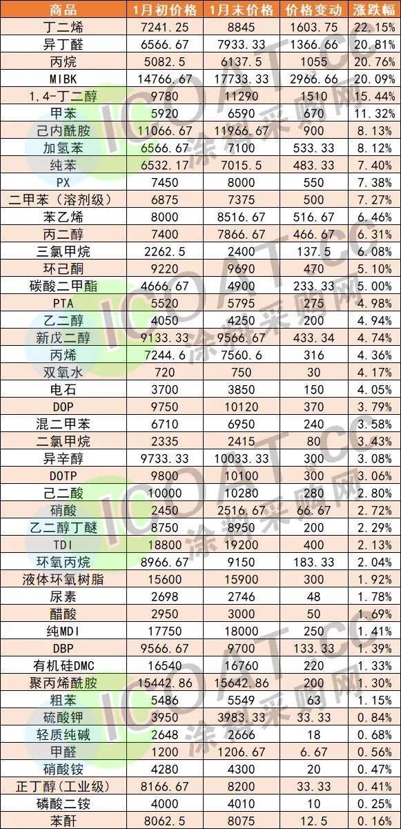 (華魯恒升1月29日產(chǎn)品報價表) 萬華化學(xué)報價表顯示,與年初價格相比,丙烯上漲400元/噸,丁二烯上漲1400元/噸,MTBE上漲300元/噸,叔丁醇上漲200元/噸,二異丁烯上漲300元/噸,苯乙烯上漲500元/噸,新戊二醇上漲1000元/噸,丙烯酸上漲300元/噸,丙烯酸丁酯上漲1000元/噸。