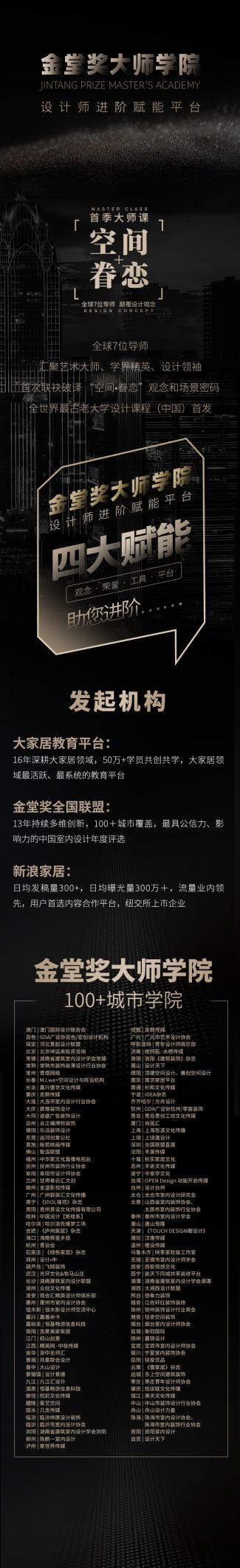 ??“金堂獎大師學(xué)院”由中國大家居教育平臺、金堂獎全國聯(lián)盟、新浪家居共同發(fā)起,聯(lián)合100+金堂獎各地城市學(xué)院,首季大師課匯聚全球七位導(dǎo)師,包括藝術(shù)大師、學(xué)界精英、設(shè)計領(lǐng)袖,首次破譯“空間·眷戀”空間場景密碼,以業(yè)主時間體驗丈量空間設(shè)計價值,認為設(shè)計的本質(zhì)是對業(yè)主在空間里的時間規(guī)劃——家,不是一個地方,而是一段時光…… ??“金堂獎大師學(xué)院(蘇州)城市學(xué)院”聘請年度百大人氣設(shè)計師做為“特聘講師”,以自身案例為基礎(chǔ)開設(shè)網(wǎng)絡(luò)直播課程,展示“空間·眷戀”觀念在作品上的實踐成果,推動業(yè)主空間體驗的提升,共同開創(chuàng)“空間·眷戀”設(shè)計師話語權(quán)新時代。