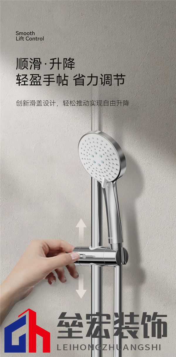 ??系列標配的手帖花灑插座,采用創(chuàng)新滑蓋設(shè)計,單指輕松推動,實現(xiàn)自由升降。