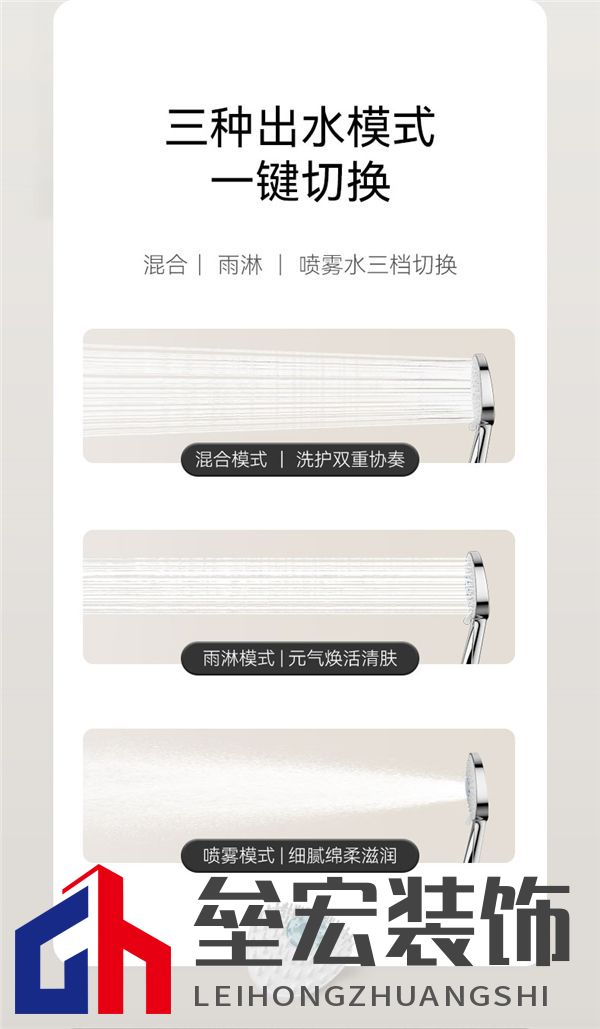 ??手持花灑配備健康硅膠出水口,同時蘊含三種出水模式:混合、雨淋、噴霧水,撥動即可切換,輕撥即可排出余水。無論是水療按摩,還是深度清洗,彈性硅膠水嘴都能保證出水流暢,安全健康。