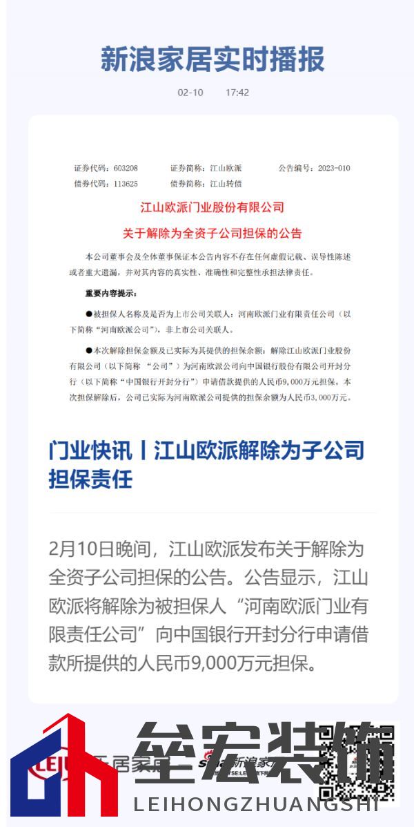??2月10日晚間,江山歐派發(fā)布關(guān)于解除為全資子公司擔(dān)保的公告。公告顯示,江山歐派將解除為被擔(dān)保人“河南歐派門業(yè)有限責(zé)任公司”向中國(guó)銀行開封分行申請(qǐng)借款所提供的人民幣9,000萬元擔(dān)保。