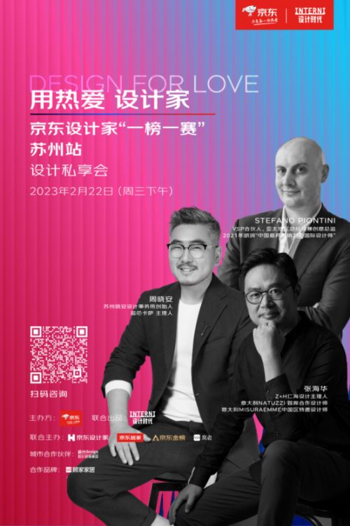 ??2月22日,京東設計家“一榜一賽”即將走進魅力姑蘇,開啟蘇州站設計私享會。設計私享會現(xiàn)場,2021年被胡潤評為“中國最具影響力的國際設計師”的 Stefano Piontini先生將攜手蘇州知名設計師張海華、周曉安及幾十位精英設計師們齊聚一堂,同時也會有京東代表與到場嘉賓們深度交流,分享經(jīng)驗,傾聽來自一線設計師的真實需求,共探當下設計師的多維發(fā)展機遇。